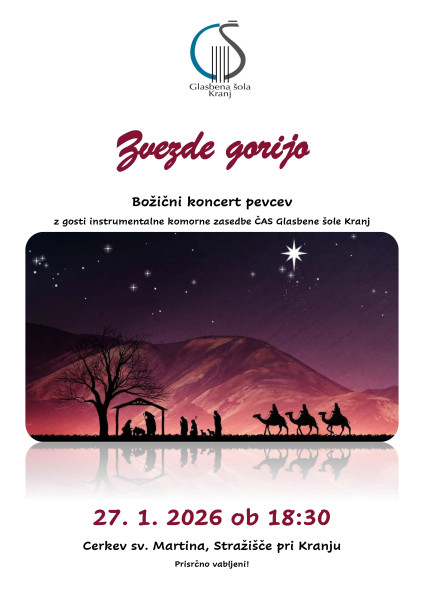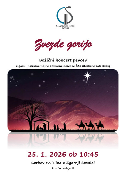 Vljudno vabljeni na božični koncert pevcev z gosti komorne zasedbe ČAS - učenci Glasbene šole Kranj, ki bo v nedeljo, 25. 1. 2026 ob 10.45 v cerkvi sv. Tilna v Zg. Besnici pri Kranju