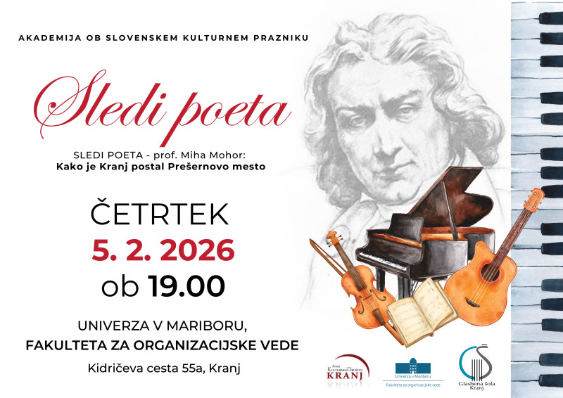 v četrtek, 5. februarja 2026 bo v knjižnici FOV - Fakulteta za organizacijske vede UM zopet potekala Akademija ob slovenskem kulturnem prazniku – Sledi poeta, ki jo pripravljajo: Zveza kulturnih društev Kranj, Glasbena šola Kranj in Fakulteta za organizacijske vede UM.