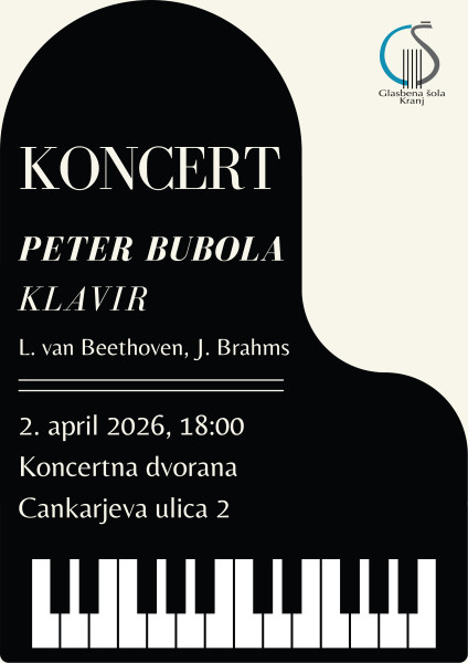 Vabimo vas na koncert Petra Bubola, ki bo v četrtek, 2. aprila 2026, ob 18.00 v dvorani GŠ Kranj (Cankarjeva 2).