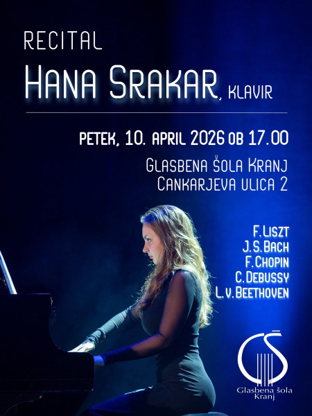 Vabimo vas na recital Hane Srakar, ki bo 10. aprila ob 17.00 v dvorani GŠ Kranj (Cankarjeva 2). Vabljeni!